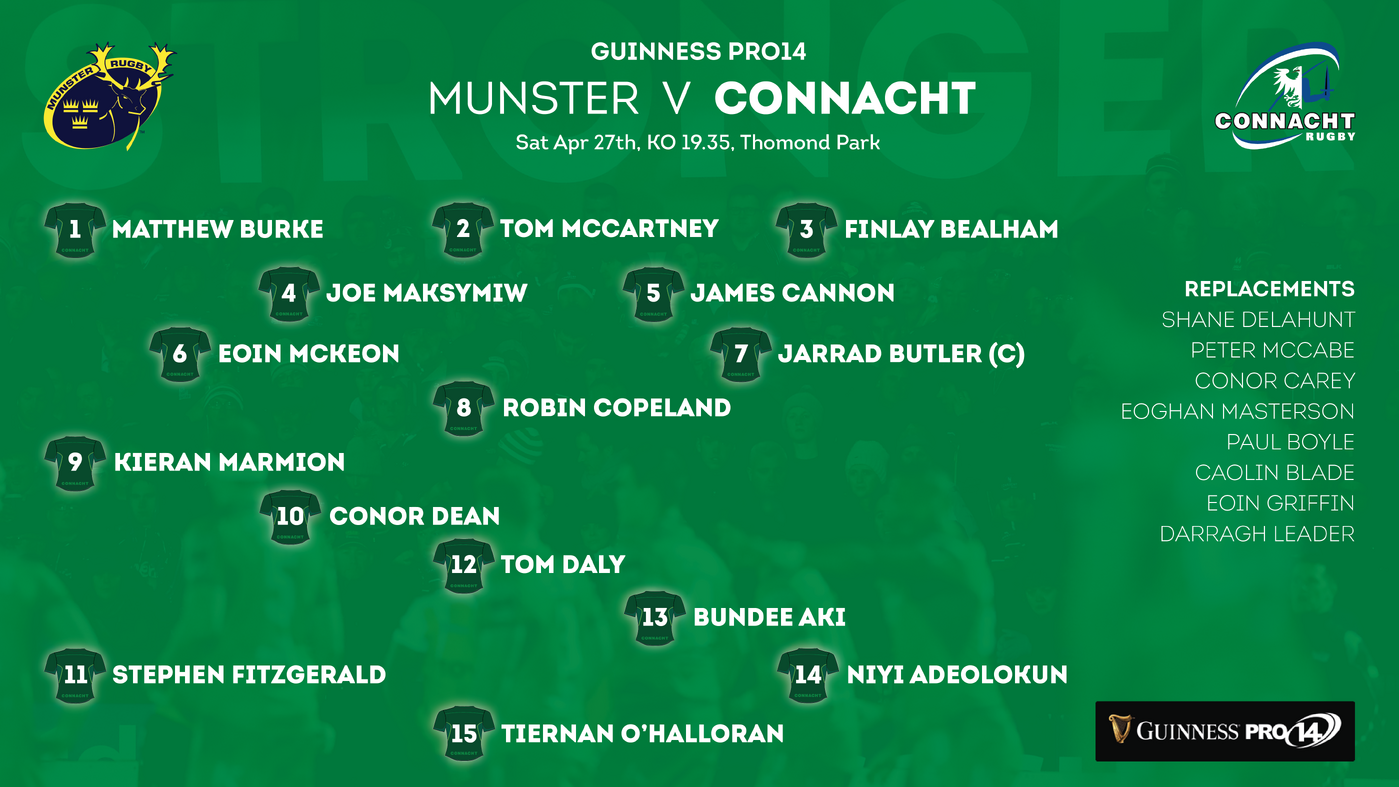 (15-9) Tiernan O’Halloran, Niyi Adeolokun, Bundee Aki, Tom Daly, Stephen Fitzgerald, Conor Dean, Kieran Marmion, (1-8) Matthew Burke, Tom McCartney, Finlay Bealham, Joe Maksymiw, James Cannon, Eoin McKeon, Jarrad Butler (Capt), Robin Copleand.