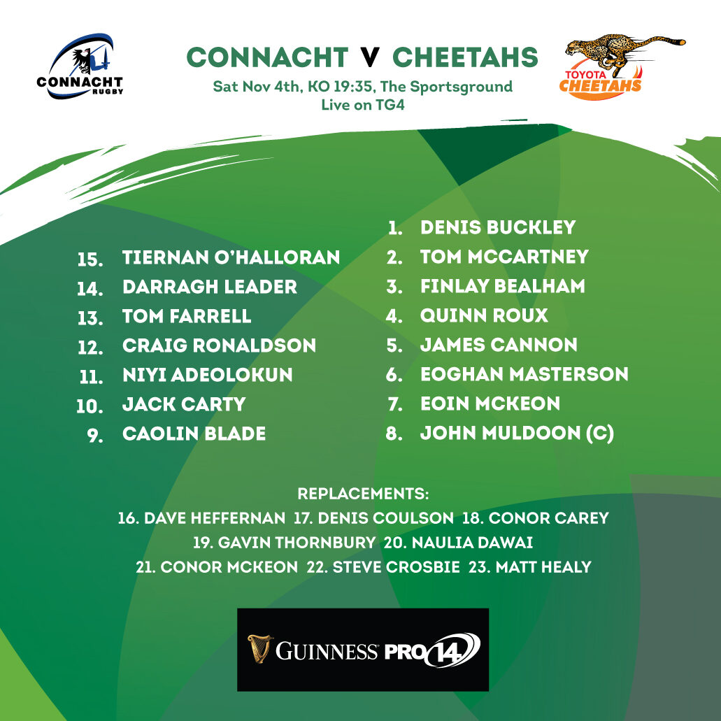With three players away on international duty, Caolin Blade starts at scrum half, Craig Ronaldson at inside centre and Quinn Roux in the second row as Connacht look to make it four wins in a row in all competitions.