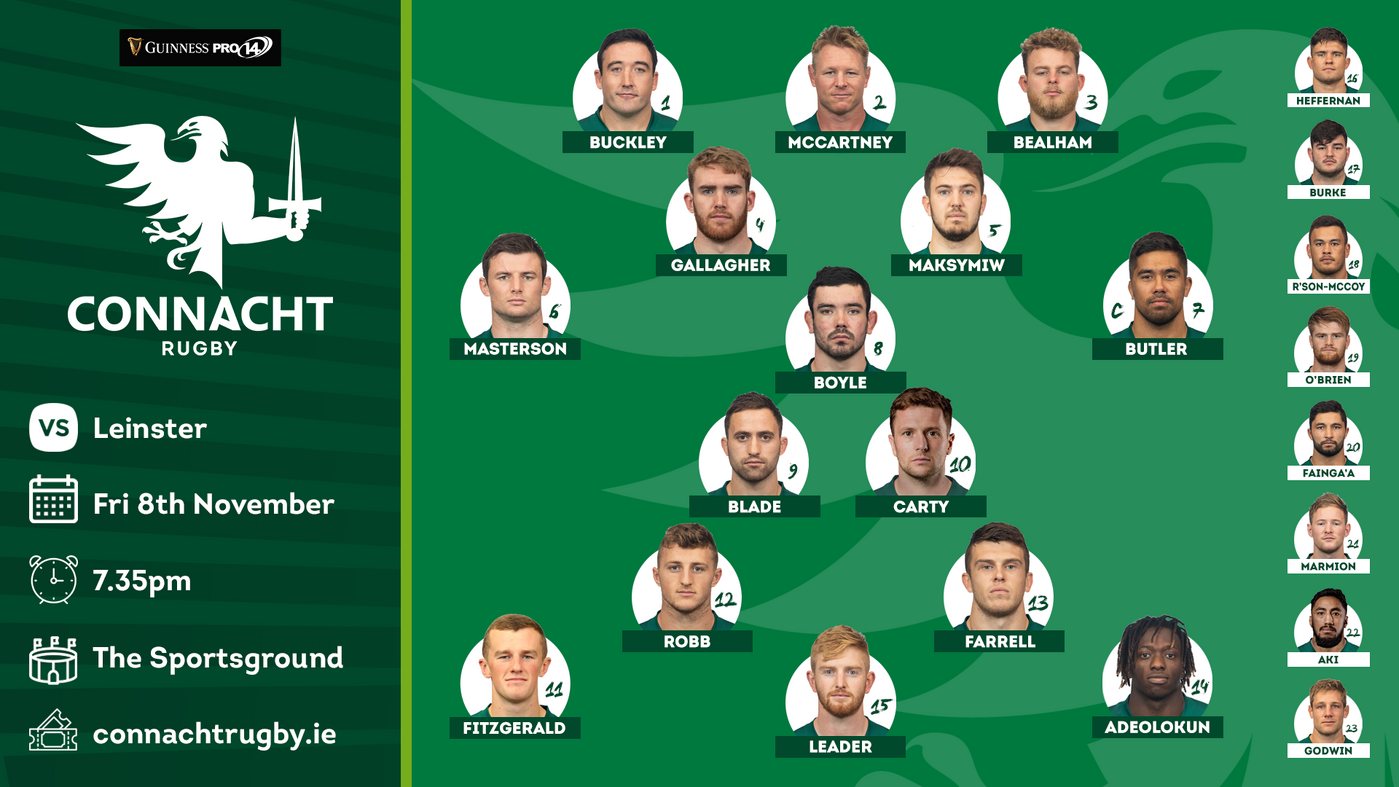 Connacht Matchday Squad V Leinster (Fri 8 NOV, 7:35 PM)(15-9): Darragh Leader, Niyi Adeolokun, Tom Farrell, Peter Robb, Stephen Fitzgerald, Jack Carty, Caolin Blade (1-8): Denis Buckley, Tom McCartney, Finlay Bealham, Cillian Gallagher, Joe Maksymiw, Eoghan Masterson, Jarrad Butler (C), Paul Boyle.