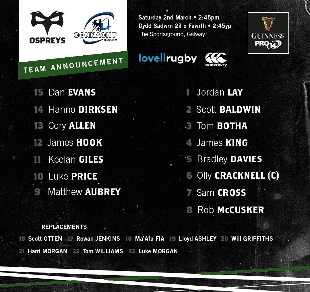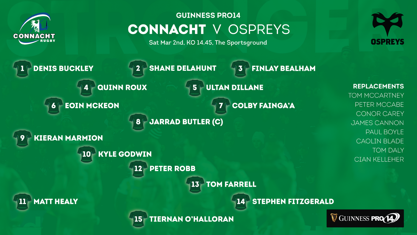 How will the two teams line up?Connacht have been boosted by the return of four players from international duty while there's also a first start of the season for Peter Robb at inside centre. Meanwhile Ospreys have made one change to the side that lost to Munster last weekend with James Hook coming in for Tiaan Thomas-Wheeler.