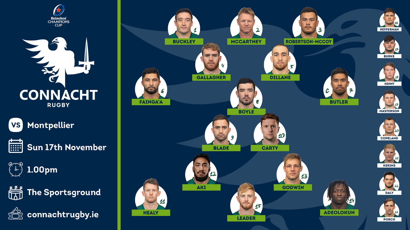 Connacht Matchday Squad V Montpellier (SUN 17 NOV, 1PM)(15-9): Darragh Leader, Niyi Adeolokun, Kyle Godwin, Bundee Aki, Matt Healy, Jack Carty, Caolin Blade (1-8): Denis Buckley, Tom McCartney, Dominic Robertson-McCoy, Cillian Gallagher, Ultan Dillane, Colby Fainga’a, Jarrad Butler (C), Paul Boyle.