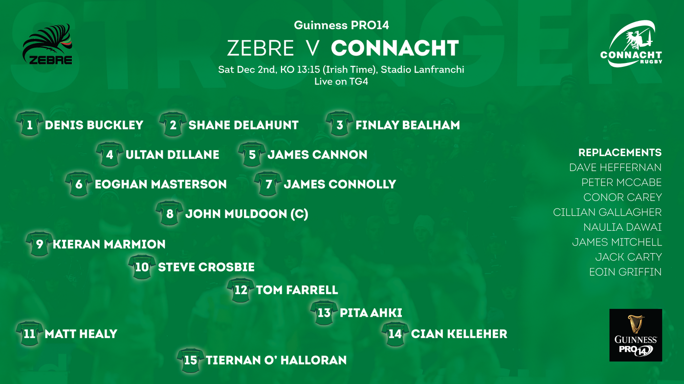 The Connacht side features a new half back pairing with Steve Crosbie starting at out-half and Kieran Marmion back at scrum half following his return from international duty. In the pack Shane Delahunt, who scored two tries against Cardiff starts at hooker where he is flanked by Denis Buckley at loosehead and Finlay Bealham at tighthead.