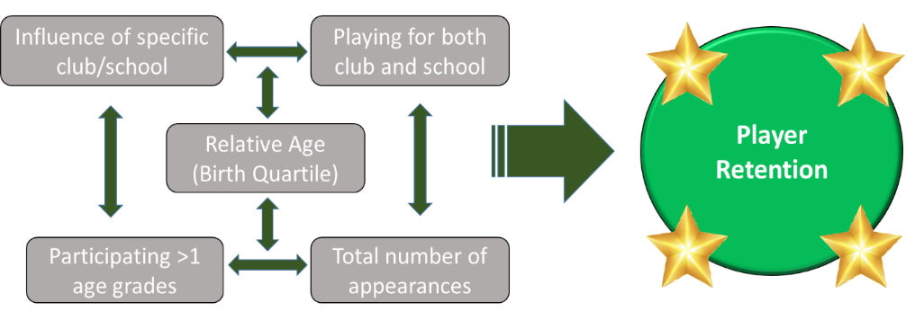 The first phase of this work-package was an exploration of the Connacht Player Database. In all over 33,000 entries were processed, focusing on whether factors such as number of appearances, playing for both club and school or at multiple age grades in a single season, and a player’s relative age influenced retention (fig. 1)