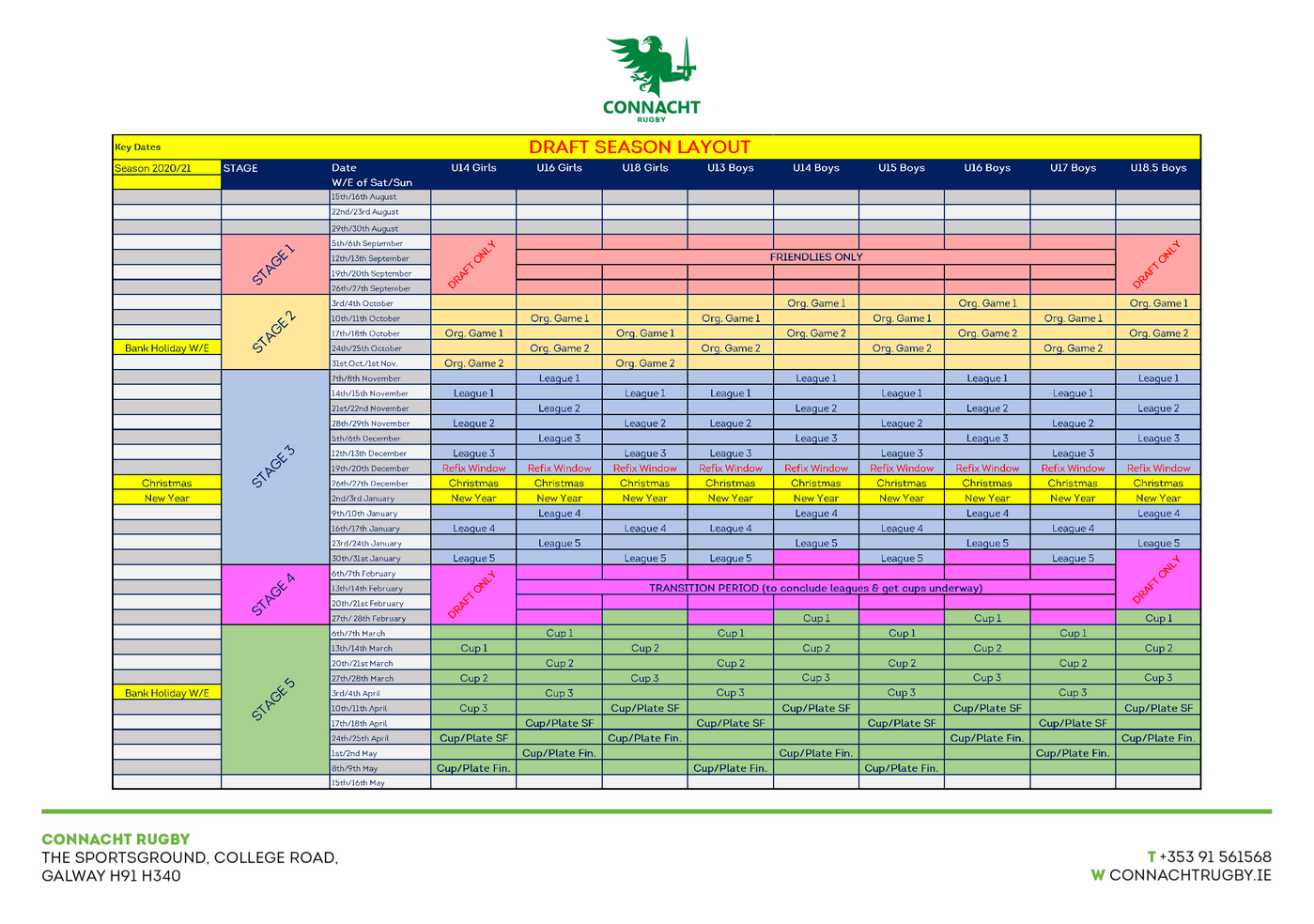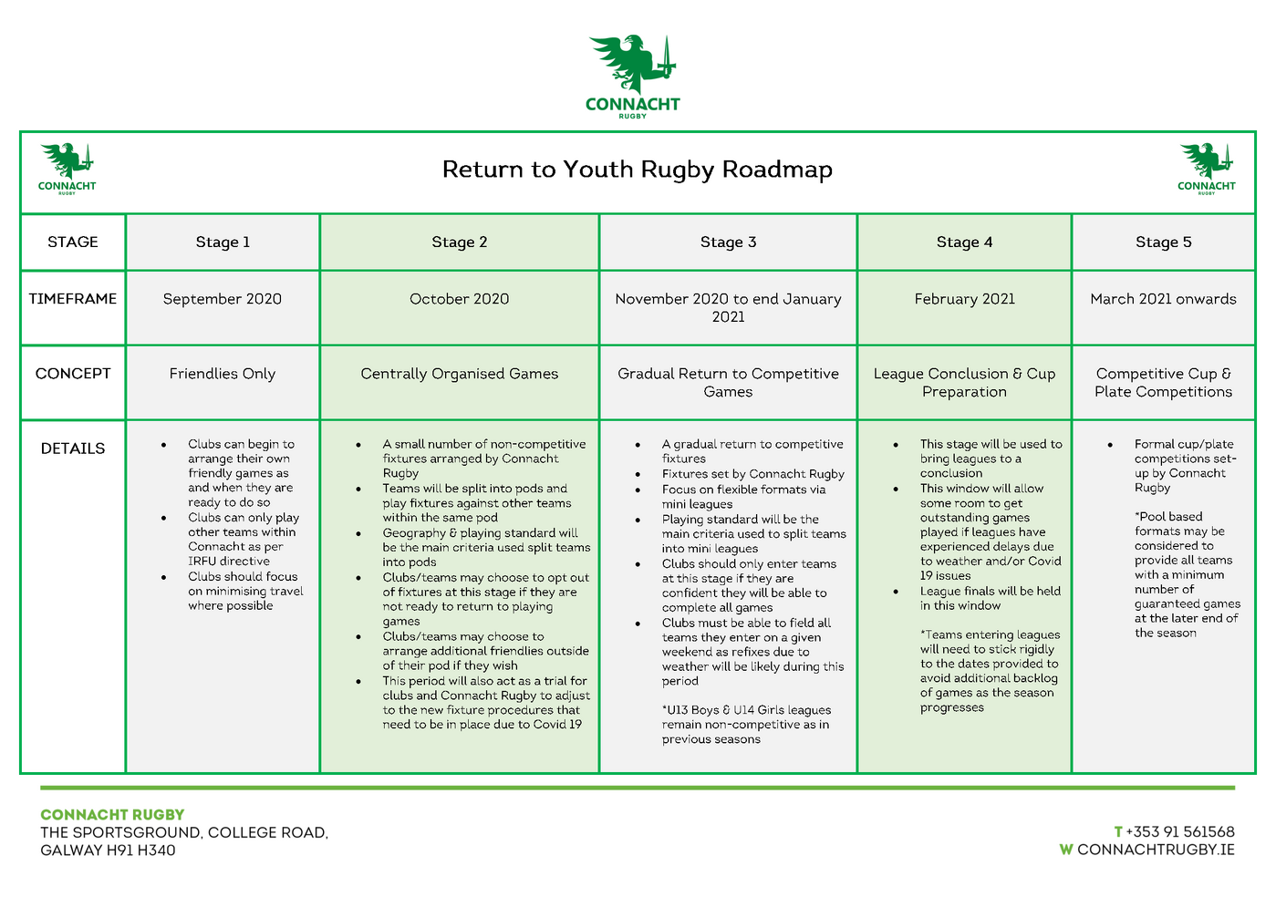 Connacht Rugby Club & Community can now confirmed the below roadmap for the return of Youth Rugby in the province. The following was agreed after many weeks and months of planning on the back of the unprecedented challenge posed by the COVID-19 global pandemic. It involves a five stage process beginning with friendlies only in September, and gradually working towards competitive league and cup action until the end of the season in May 2021.