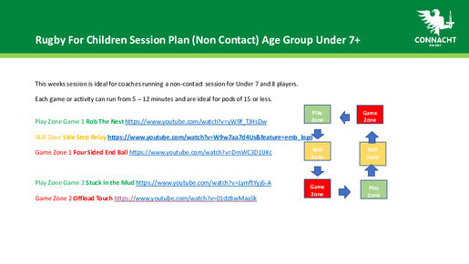 This week's session is ideal for coaches running a non-contact session for Under 7 and 8 players. Each game or activity can run from 5 – 12 minutes and are ideal for pods of 15 or less.